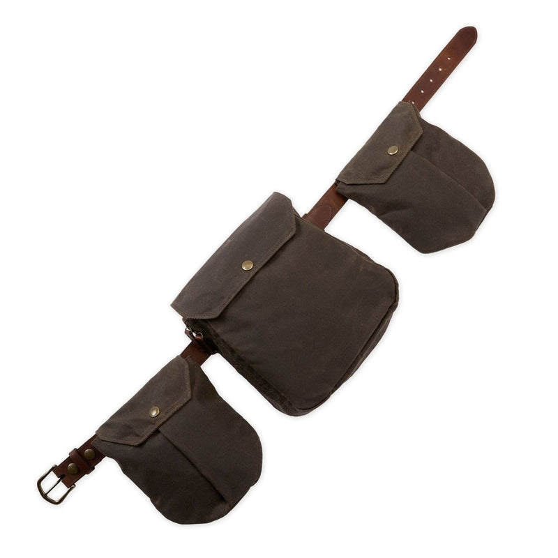 The Quail Belt is a classic three-pouch hunting belt, with two shell pockets on either side, a handy large game pocket in the rear, solid brass belt buckles, and a heavy-duty full-grain leather belt. All of the pockets are constructed from the same waxed shelter cloth as their proven outerwear. They each have a snapped flap closure and are lined with nylon on the interior. The two shell pockets incorporate a second flap stud inside the pocket, so the flap can be stowed out of your way as the action heats up. The rear game pouch has a bottom zipper so you can easily dump its contents and clean the interior. The belt itself is made from a heavy-duty version of their exclusive U.S. origin, vegetable tanned leather. This pull-up leather develops a rich, unique patina with wear.