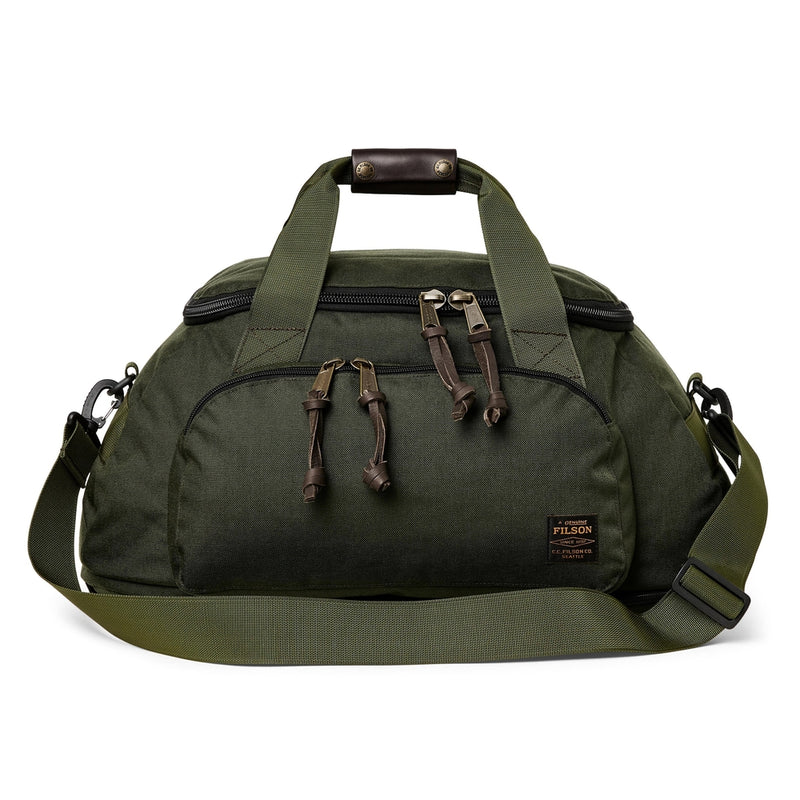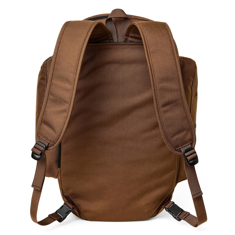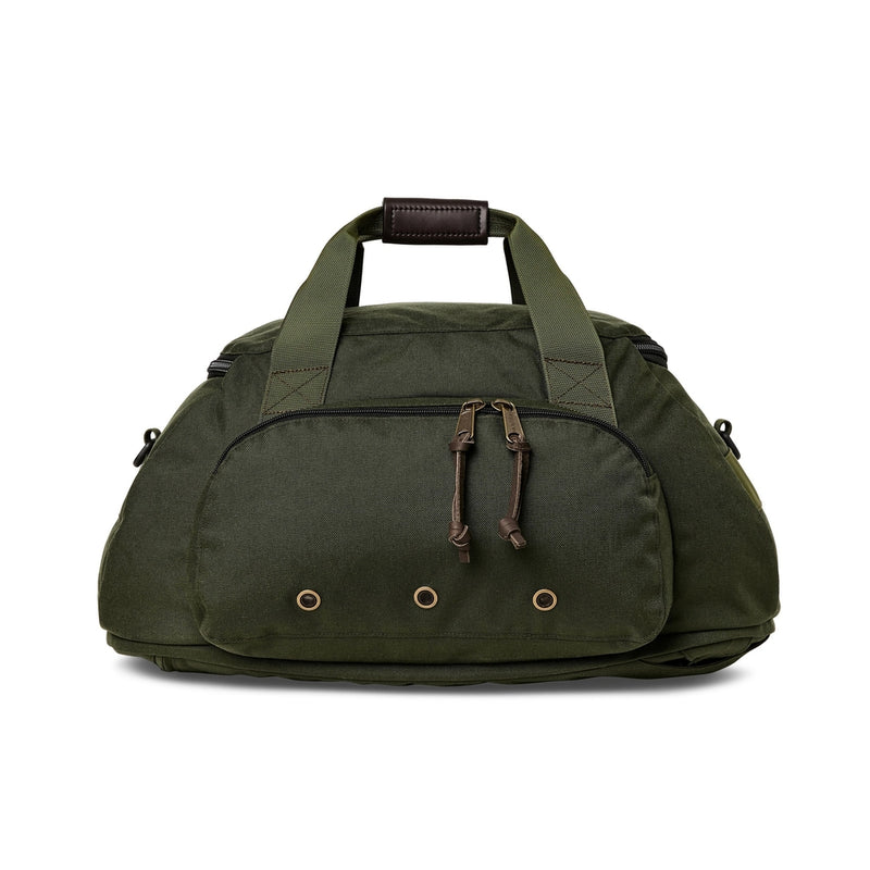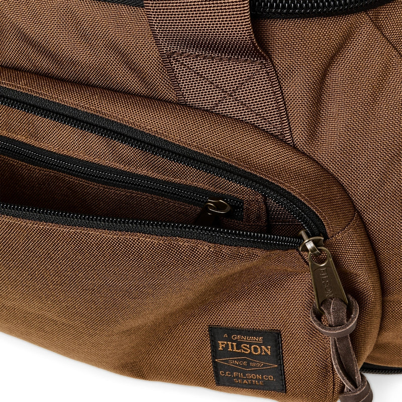 This all-purpose Filson bag combines versatile utility and exceptional durability that can be used as a duffle bag, or, as a backpack with the stowaway shoulder straps. The lightweight 1000-denier Cordura nylon fabric is woven with the same basketweave pattern as ballistic nylon. The U-shaped top zipper provides easy access to gear. A zippered exterior pocket with internal security pocket keeps essentials close at hand. A second exterior zipper accesses a bag that expands into the main compartment to keep wet or dirty gear separated from the rest of your load. Padded backpack straps can be stowed into the bottom sleeve to avoid snagging on other gear or in luggage compartments. The handles and detachable shoulder strap are made from strong, wide nylon webbing. Bridle Leather carry grip. Padded pocket for a laptop up to 16".
