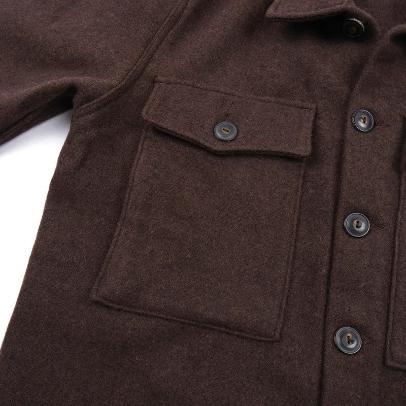 The Freenote Midway CPO takes it's cues from mid-century  US Navy Chief Petty Officer's wool jackets used to keep warm during their cold-weather work duties. The CPO shirt has become a contemporary timeless piece in the modern man's wardrobe that transcends it's military roots.  This version is made from a thick and soft melton wool blend with oversized utilitarian chest pockets, and a straight bottom hem.  A cold weather classic.