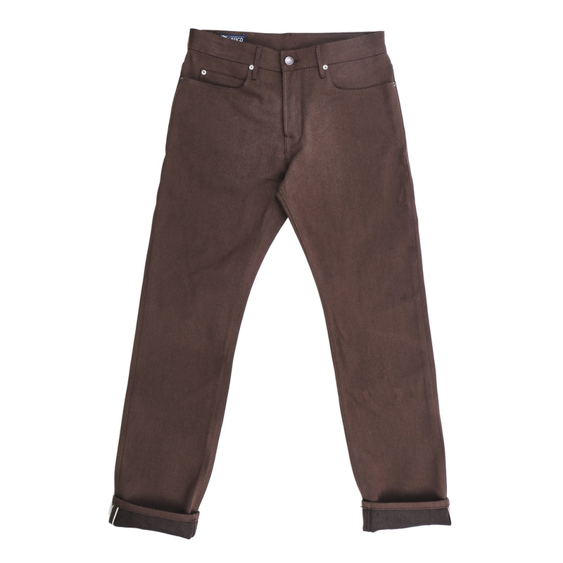 From Freenote Cloth, the Trabuco Classic Taper Fit in a 15 oz. dark brown raw selvedge denim from Japan and sewn in the USA.  The Trabuco Fit has a relaxed rise, a full thigh, a full knee, with a straight cut down to opening.  This denim has a two-piece waistband, custom herringbone pocketing from Japan, custom copper hardware, and a button-fly opening.